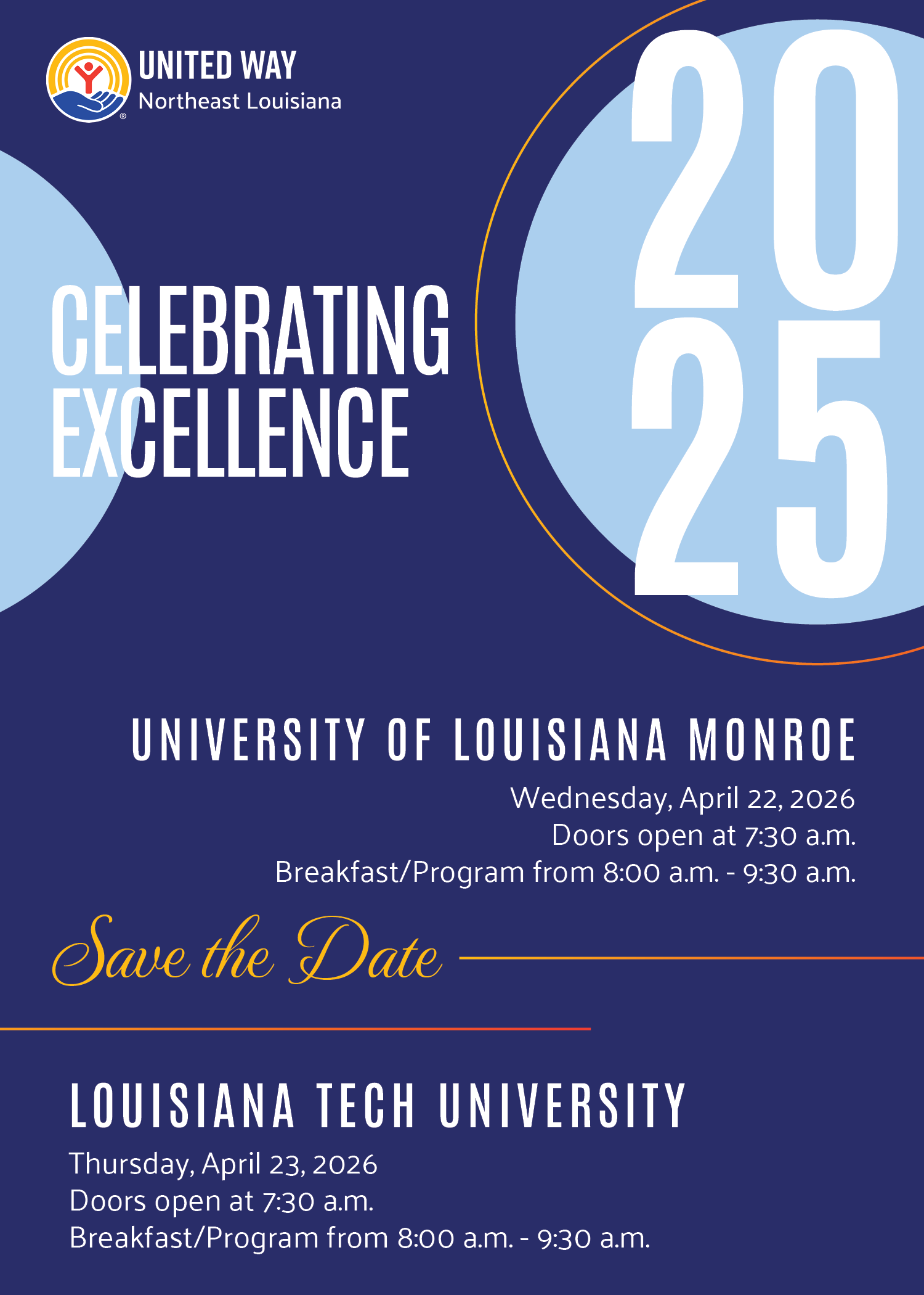 Our Celebrating Excellence event is United Way of Northeast Louisiana's annual celebration of generosity and unwavering community spirit, seeking to honor community partners, campaigns, volunteers, and donors. This year's events are scheduled as follows:
